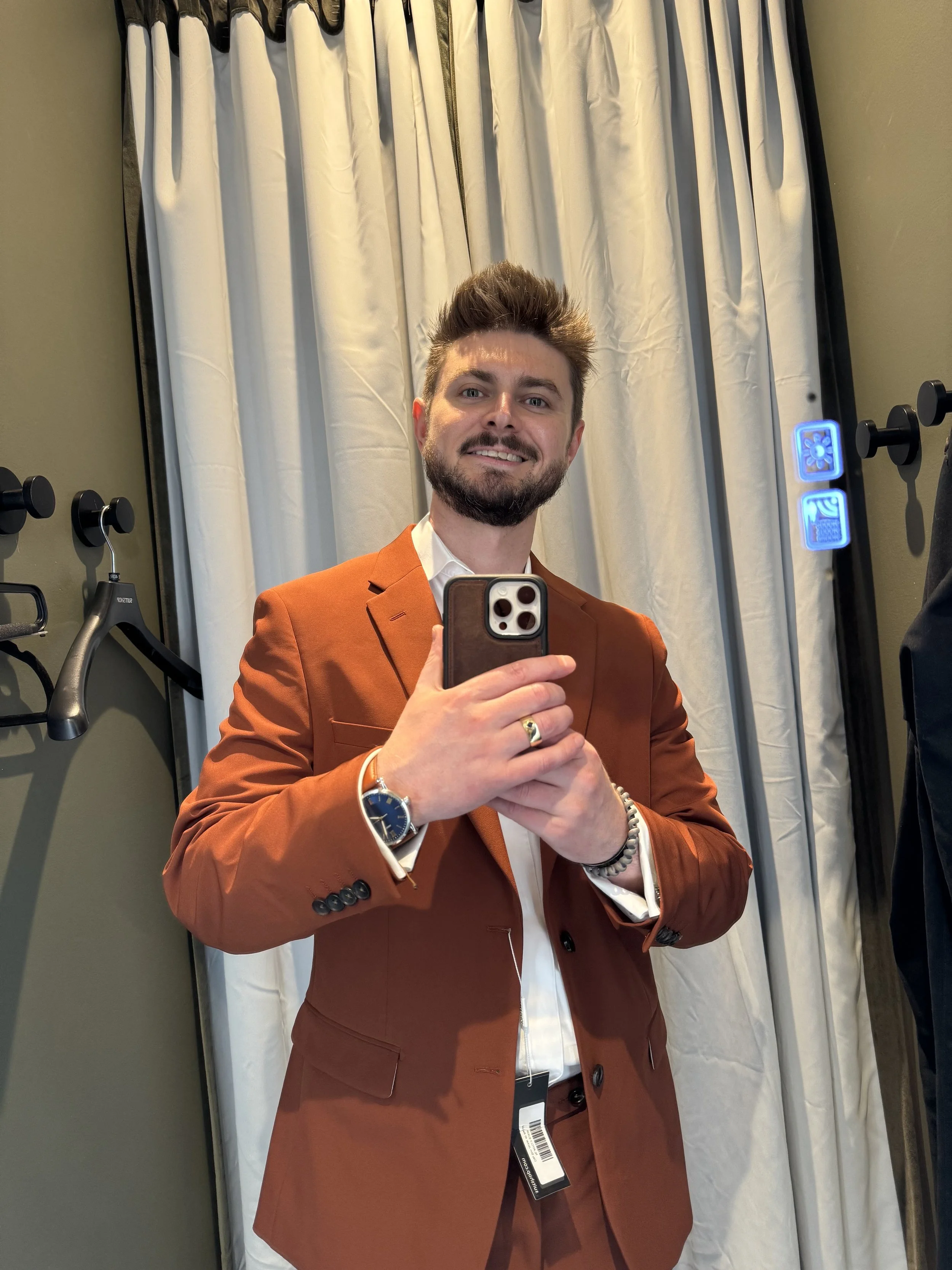 On July 23, we attended our appointment at Suit Shop. He tried two shades: burnt orange and clay. Clay won, and the full ensemble - vest, jacket, pants, and white shirt - looked so good.