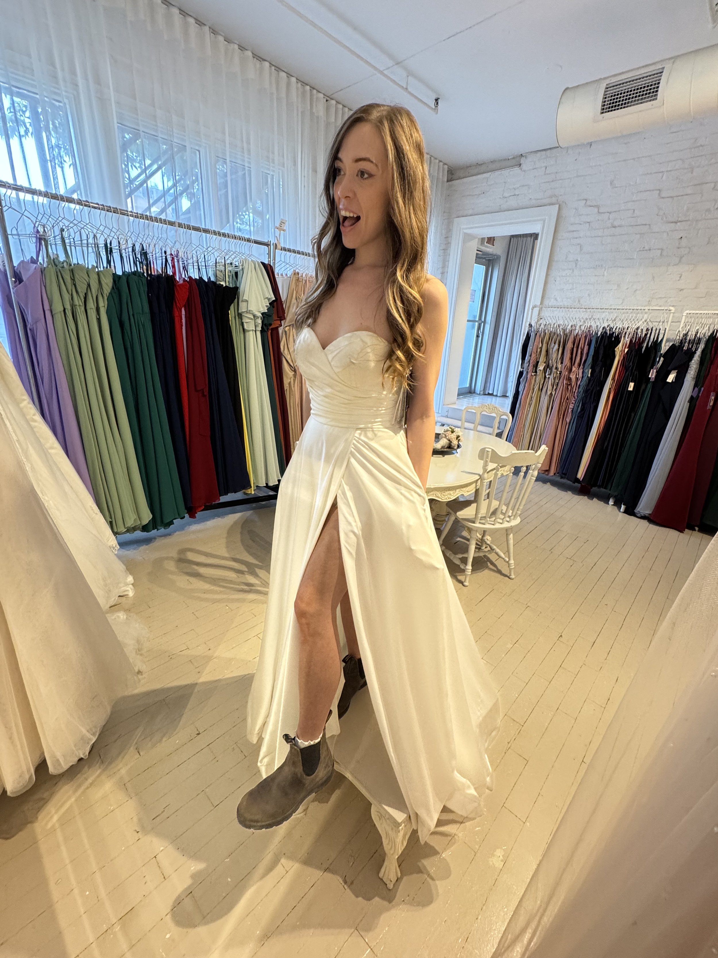 But that presented a problem. We didn’t want to gamble hundreds of dollars on a dress online, and we also didn’t want to miss that magical “say yes to the dress!” moment in person. According to every wedding article we could find, it’s recommended to start dress shopping a full year in advance. Most dresses are made to order and can take months to be ready. We didn’t have that kind of lead time! We needed something we could get our hands on within just a few months, without compromising the experience.