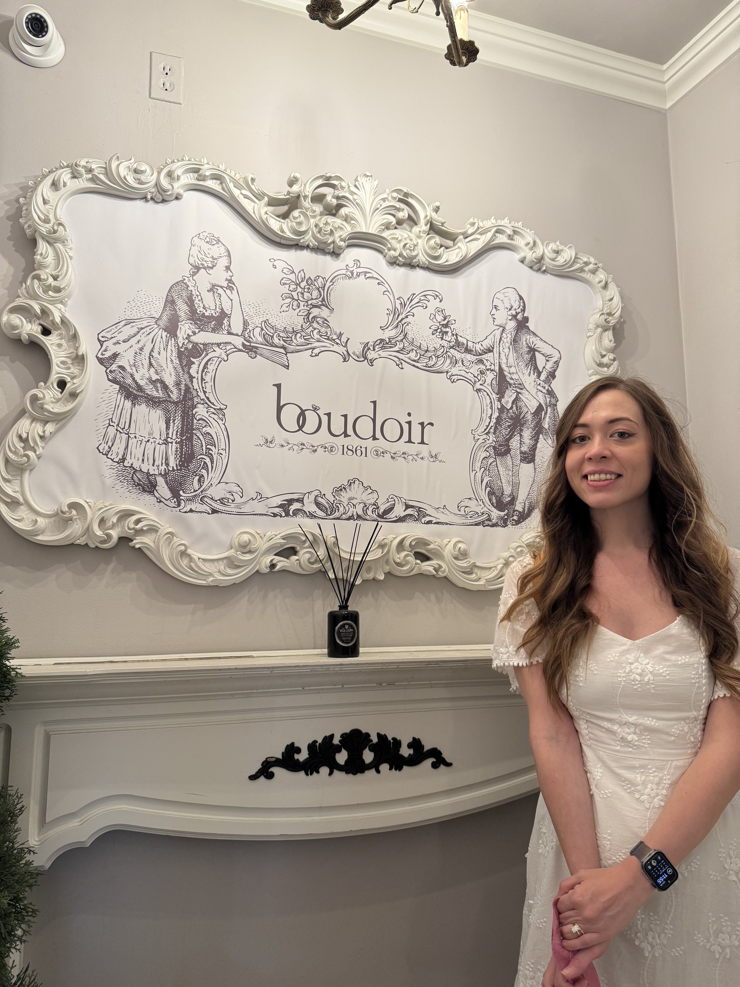 At Boudoir 1861, Hannah tried on several gowns with Alex cheering her on. The first two dresses brought happy tears, and though she tried on more, those first two were special.