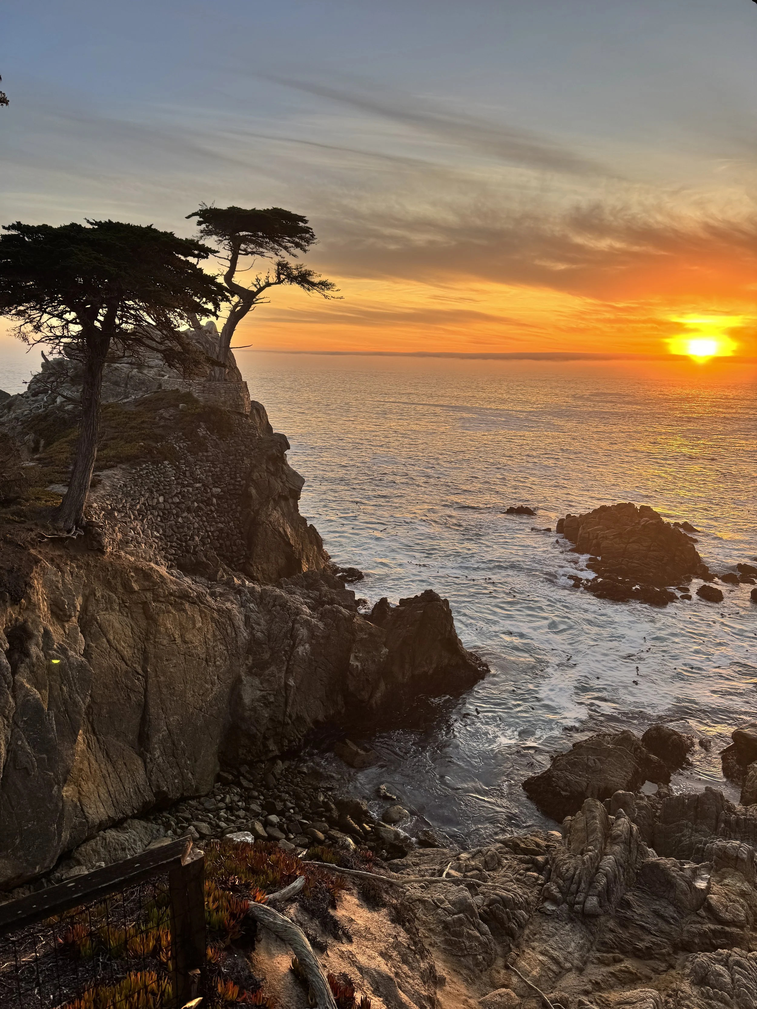 This was a beautiful drive! We left our inn at 4pm and started the drive during golden hour. There are little pull offs on the drive every so often to see the different coves and features. We had tons of fun hopping out of the car, seeing each sight and then running back to the car to make the most of the setting sun. One spot was called the Lone Cypress. For the last 25 years, a single Cypress tree grew here on the rocky outcropping above the ocean. This was our last stop and was an incredible spot to watch the sunset from.
